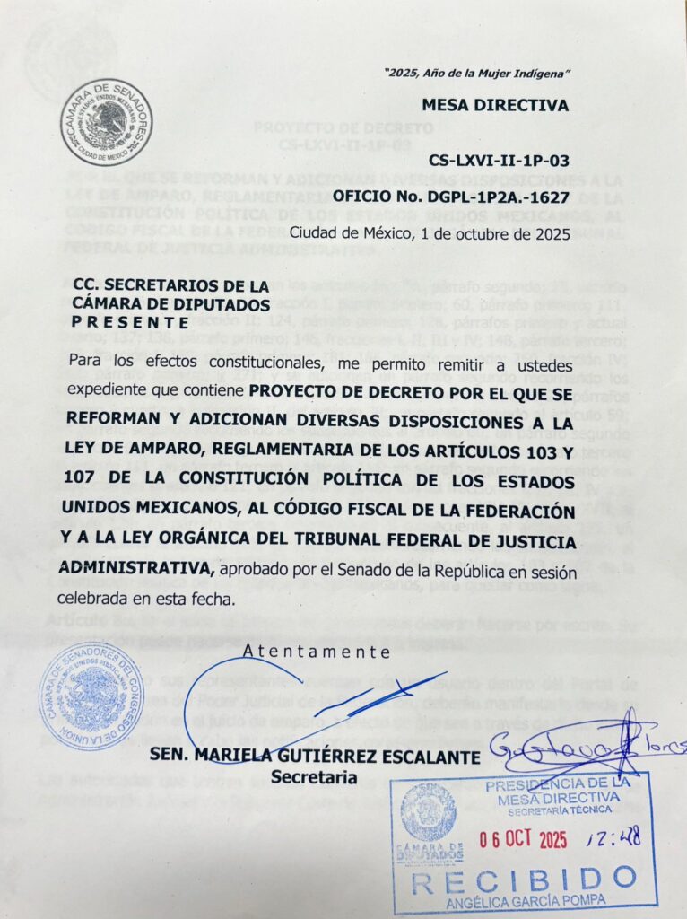 “Informo que he recibido del Senado de la República la minuta relativa a las reformas de la Ley de Amparo”, señaló la legisladora, quien indicó que el documento será publicado en la Gaceta Parlamentaria y turnado a las comisiones correspondientes para su análisis.