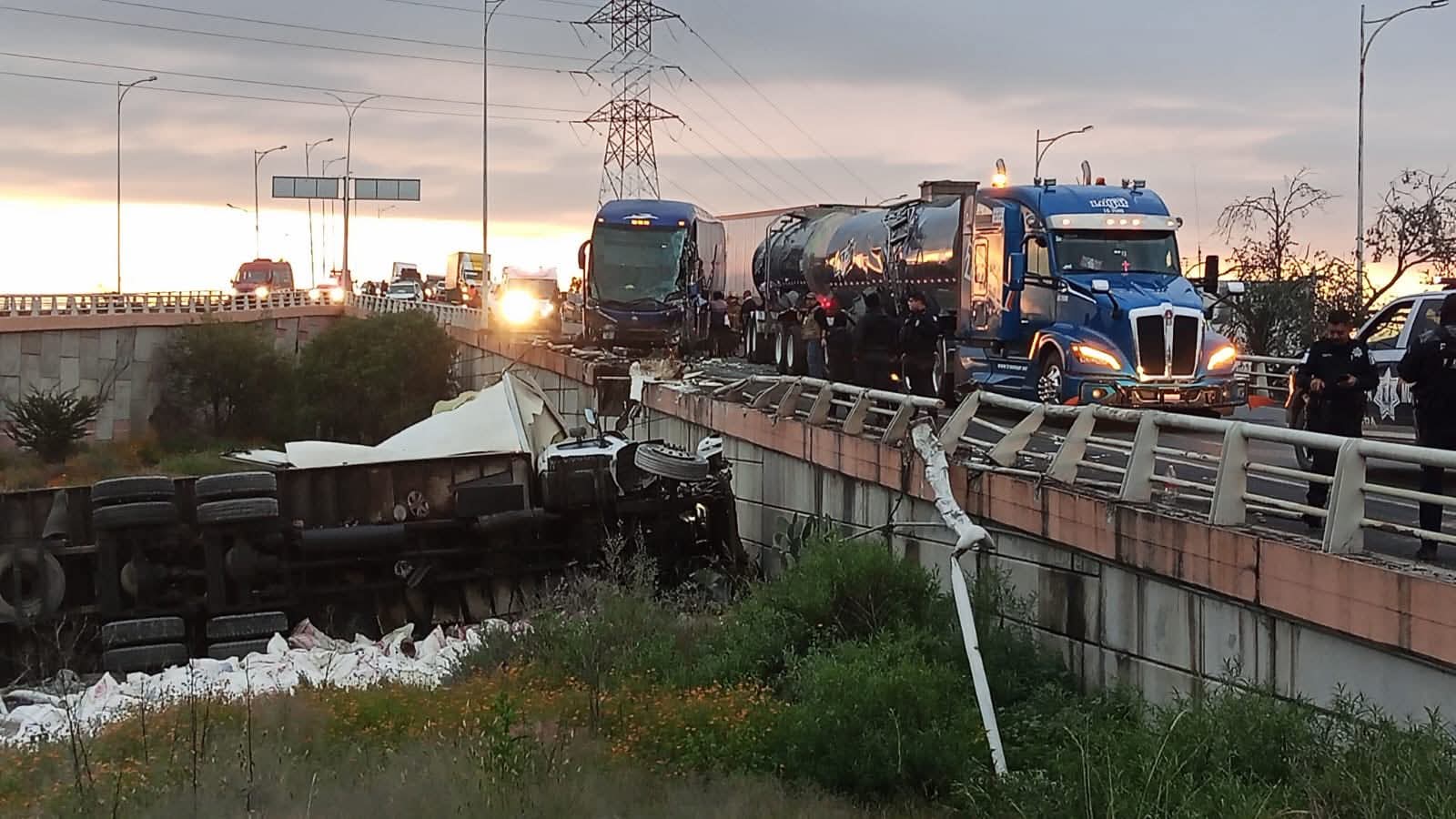 Morelos, Zacatecas.- Un choque por alcance entre dos camiones de carga, un autobús de pasajeros y un vehículo particular desató el caos en la carretera federal 45, en el municipio de Morelos, vecino a la capital del estado, cerca del distribuidor de acceso al Aeropuerto Internacional de Zacatecas.