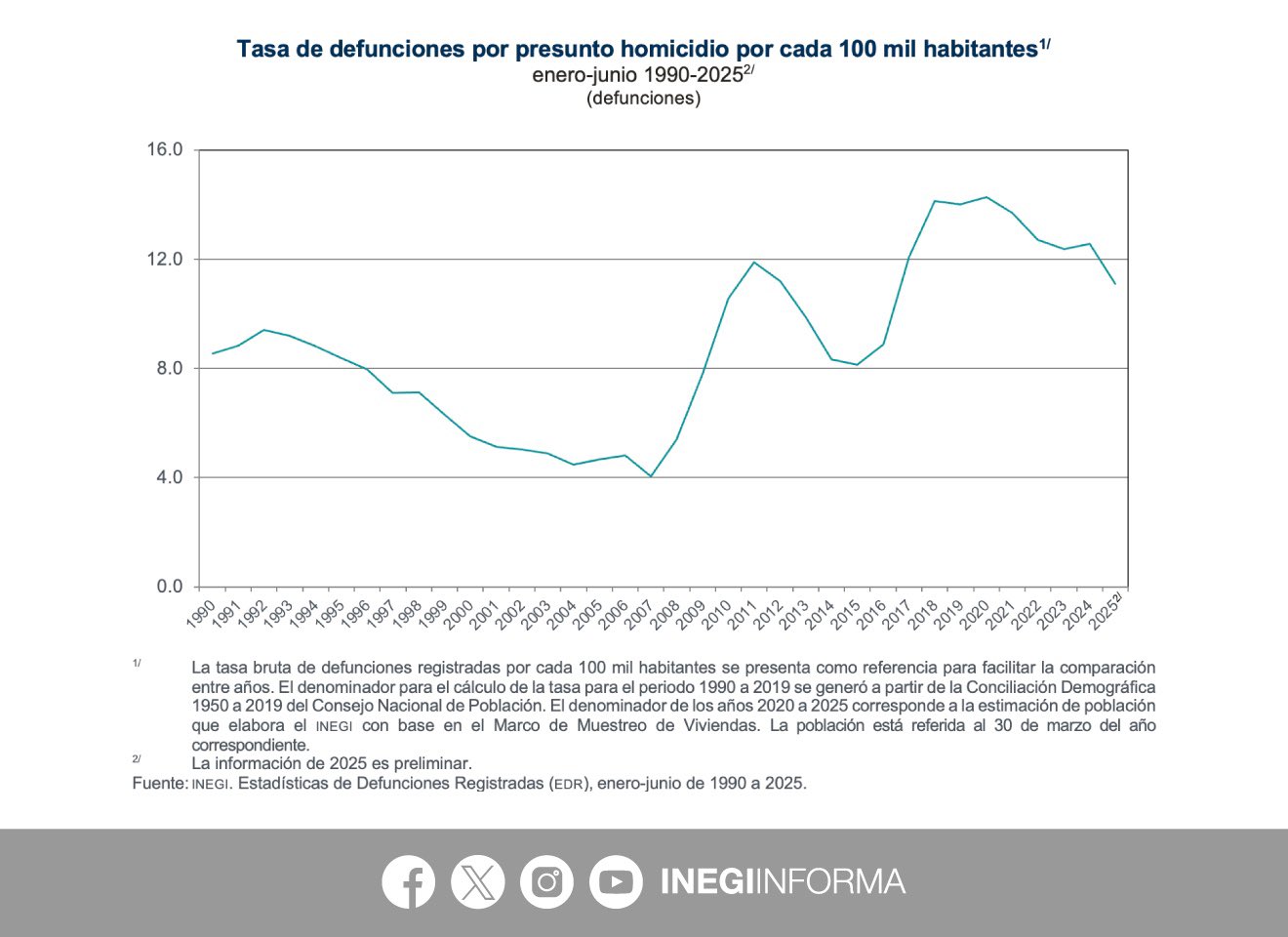 El Instituto Nacional de Estadística y Geografía (INEGI) informó que la tasa semestral de homicidios en México se redujo a 11.1 por cada 100 mil habitantes durante la primera mitad de 2025, por debajo del 12.6 registrado en el mismo periodo de 2024.