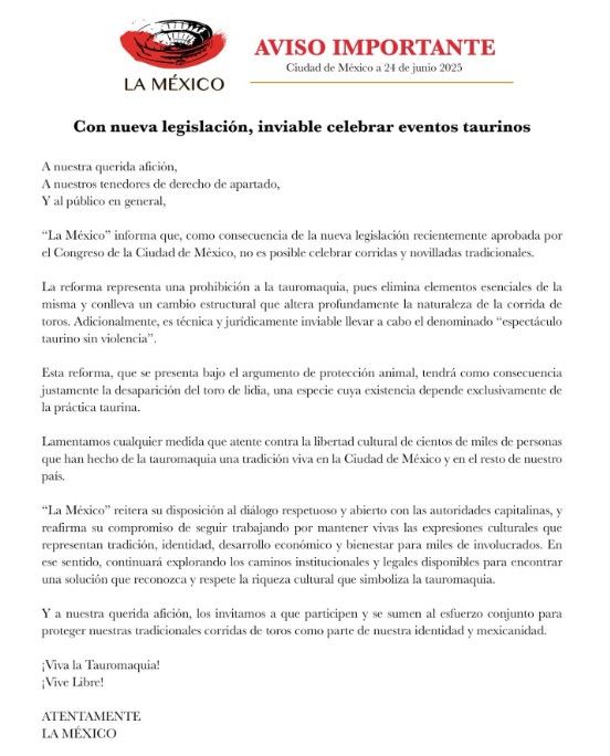 En su posicionamiento, la Plaza de Toros reiteró su disposición al diálogo respetuoso y abierto con las autoridades capitalinas, además de reafirmar su compromiso con la preservación de las expresiones culturales que —afirmó— representan identidad, tradición, desarrollo económico y bienestar para miles de familias vinculadas a esta actividad.