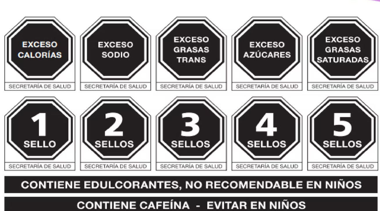 Los sellos, con forma de octágono y colocados en la parte frontal de los empaques, alertan sobre los niveles altos de cinco componentes críticos: calorías, sodio, grasas trans, azúcares y grasas saturadas, mediante las leyendas “Exceso de…”.