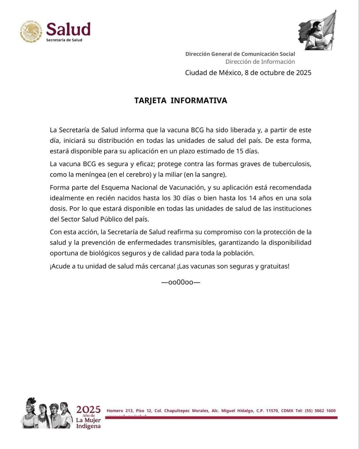 La Secretaría de Salud informó que la vacuna BCG, utilizada para proteger contra las formas graves de tuberculosis, ya fue liberada y comenzará su distribución en todas las unidades médicas del país.