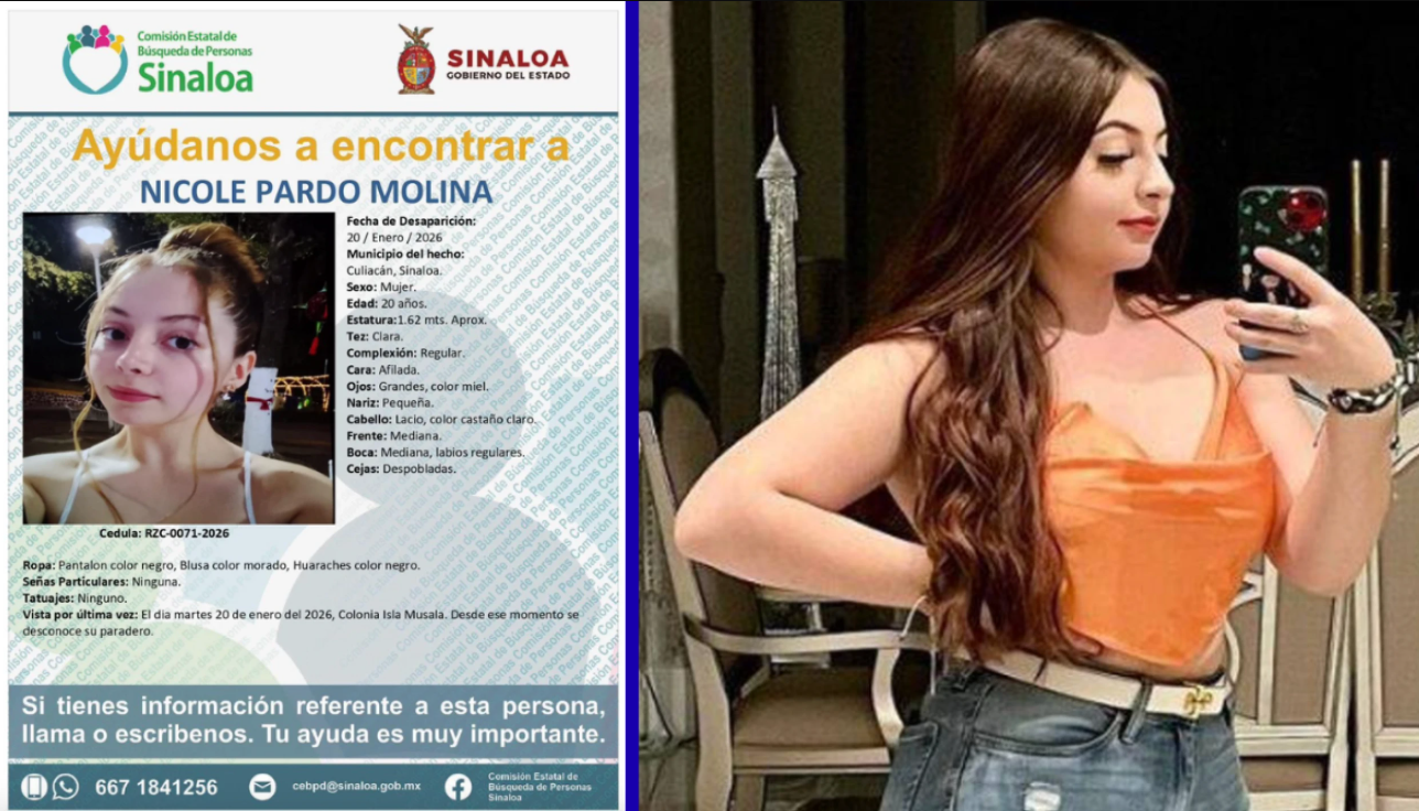 La creadora de contenido conocida como “la Nicholette”, identificada como Nicole Pardo Molina, fue localizada con vida tras haber sido secuestrada el pasado 20 de enero en una plaza comercial de Isla Musala, en Culiacán, Sinaloa.