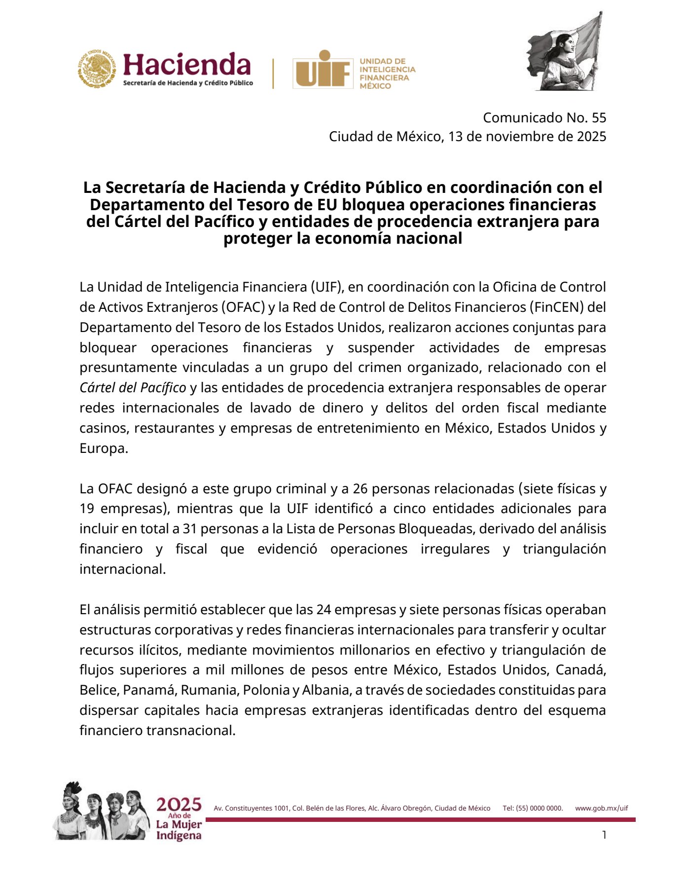 “Las acciones conjuntas con la OFAC (Oficina de Control de Activos Extranjeros) y FinCEN (Red de Control de Delitos Financieros) permitieron bloquear operaciones financieras y suspender actividades de empresas presuntamente vinculadas a un grupo del crimen organizado asociado al Cártel del Pacífico”, señaló Hacienda.