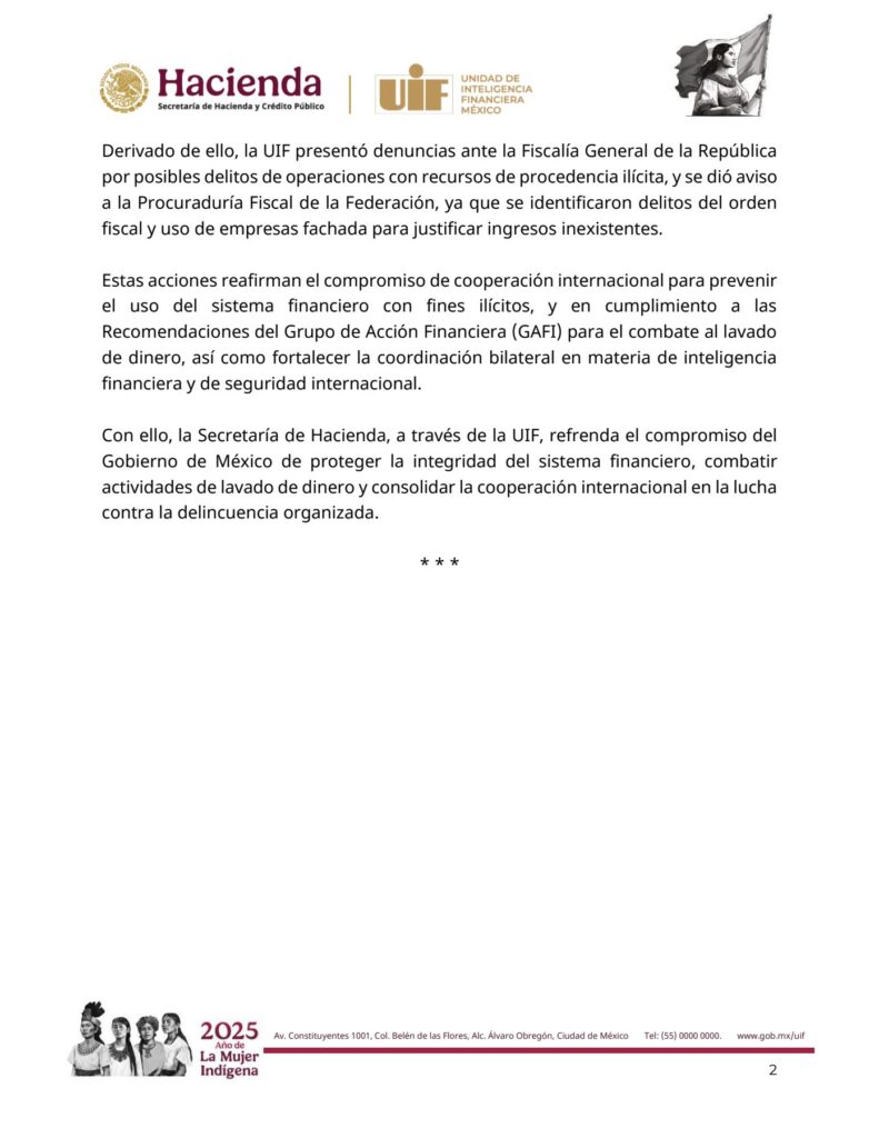La dependencia subrayó que estas acciones forman parte de los compromisos internacionales de México para prevenir el uso del sistema financiero con fines ilícitos y cumplir con las recomendaciones del Grupo de Acción Financiera Internacional (GAFI).
