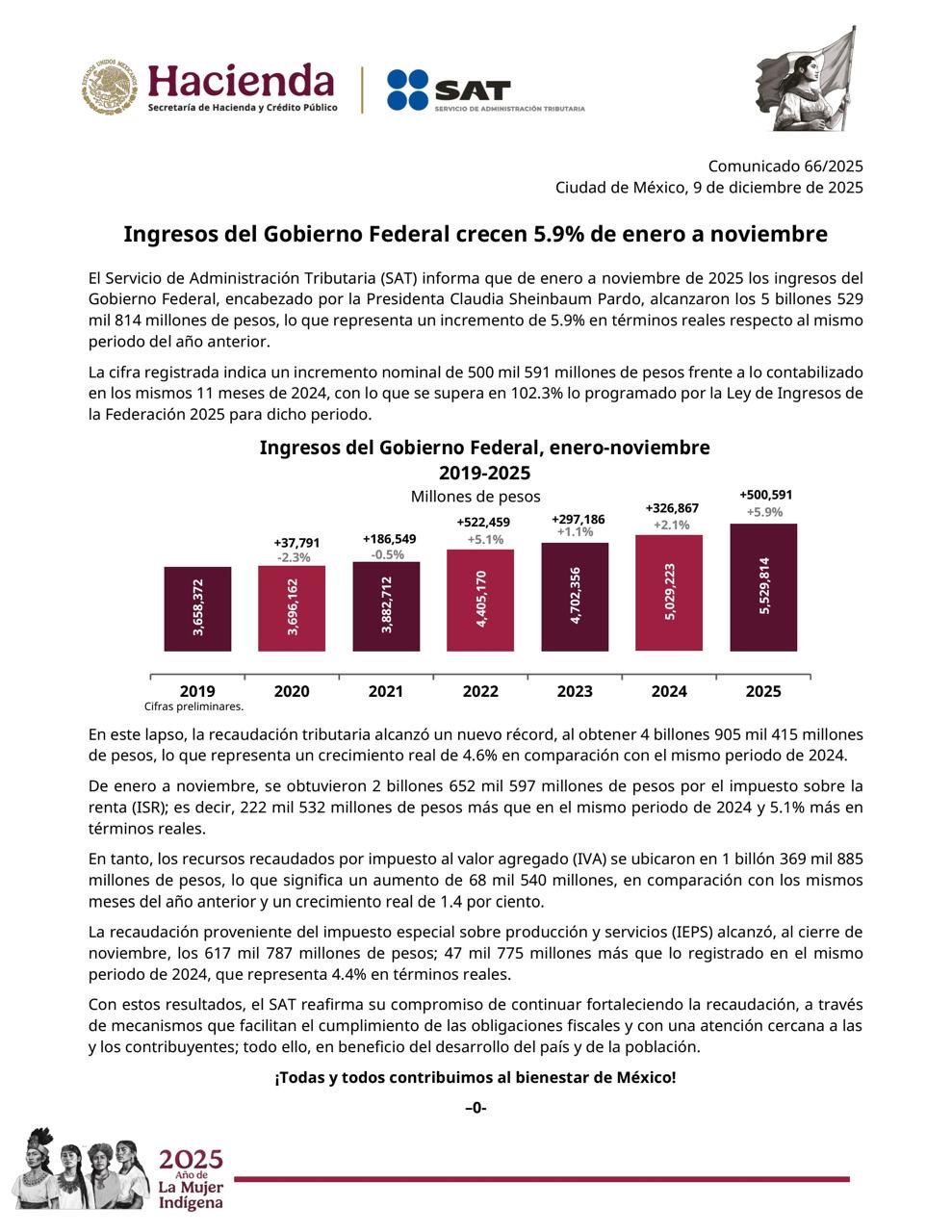 El organismo detalló que los ingresos totales del Gobierno federal, encabezado por la presidenta Claudia Sheinbaum, sumaron 5.52 billones de pesos, lo que representa un incremento real de 5.9 % frente al año anterior. En términos nominales, este aumento equivale a 500 mil 591 millones de pesos.