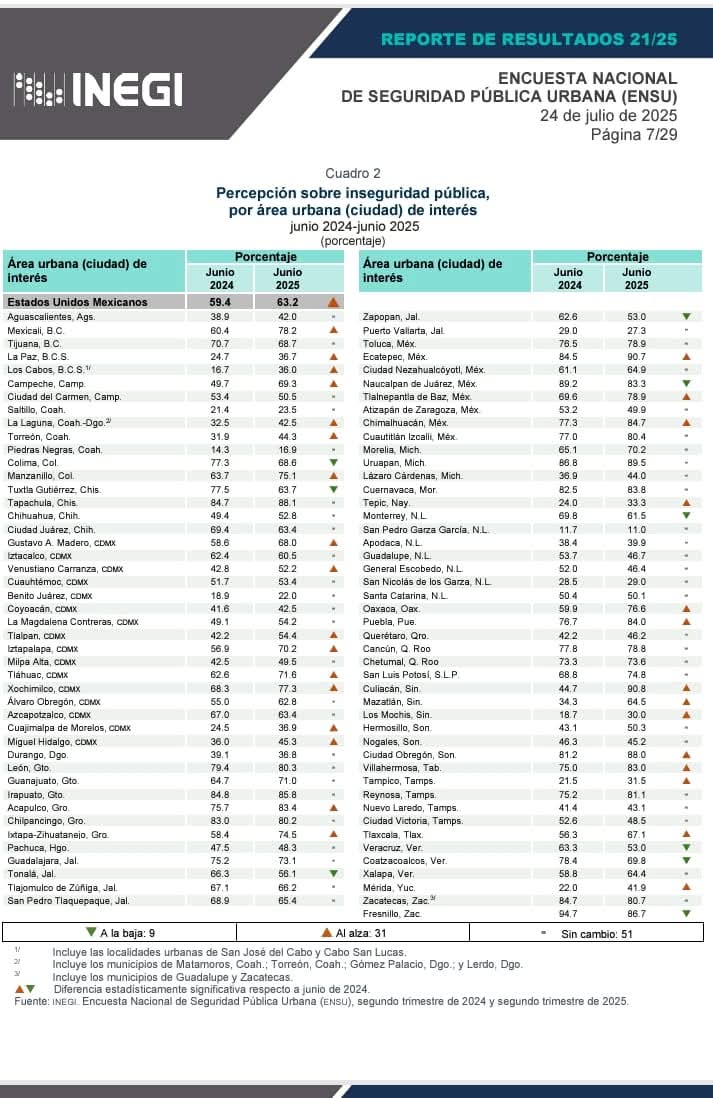 La percepción de inseguridad en México registró un aumento significativo durante junio de 2025, de acuerdo con los resultados de la Encuesta Nacional de Seguridad Pública Urbana (ENSU) publicada por el INEGI. El 63.2% de la población de 18 años y más consideró que es inseguro vivir en su ciudad, frente al 61.9% reportado en marzo y el 59.4% de junio del año pasado.