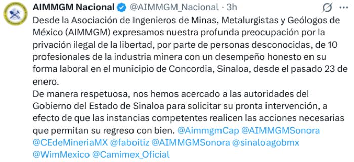 Diez empleados de una empresa minera canadiense, Vizsla Silver, fueron secuestrados hace cinco días en el municipio de Concordia, Sinaloa, informó la Asociación de Ingenieros de Minas, Metalurgistas y Geólogos de México (AIMMGM).