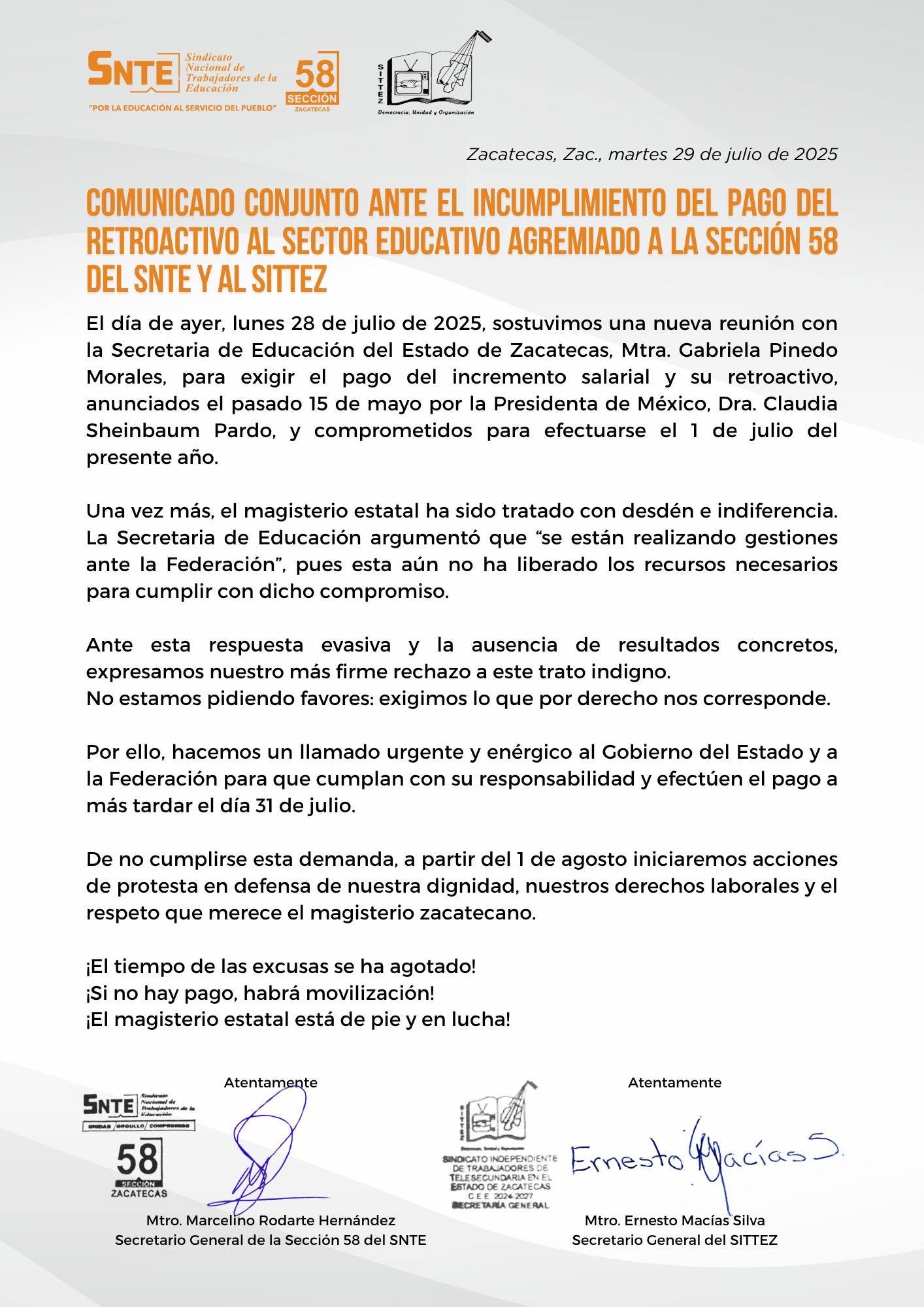 A través de un comunicado conjunto, las secciones sindicales SNTE 58 y SITTEZ denunciaron que una vez más el magisterio zacatecano ha sido ignorado por las autoridades estatales, al no cumplirse con el pago del incremento salarial y su retroactivo, comprometido desde el 1 de julio.