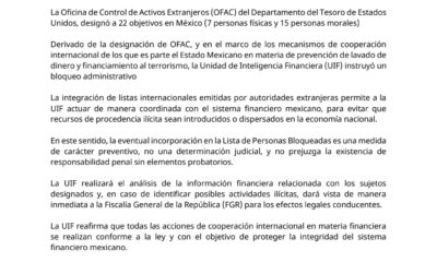 La Unidad de Inteligencia Financiera (UIF) anunció la aplicación de un bloqueo administrativo a personas y empresas señaladas por la Oficina de Control de Activos Extranjeros...